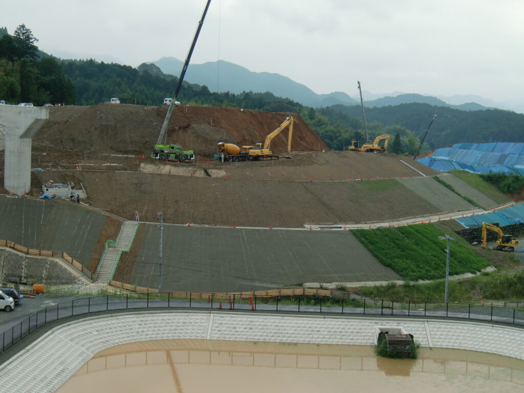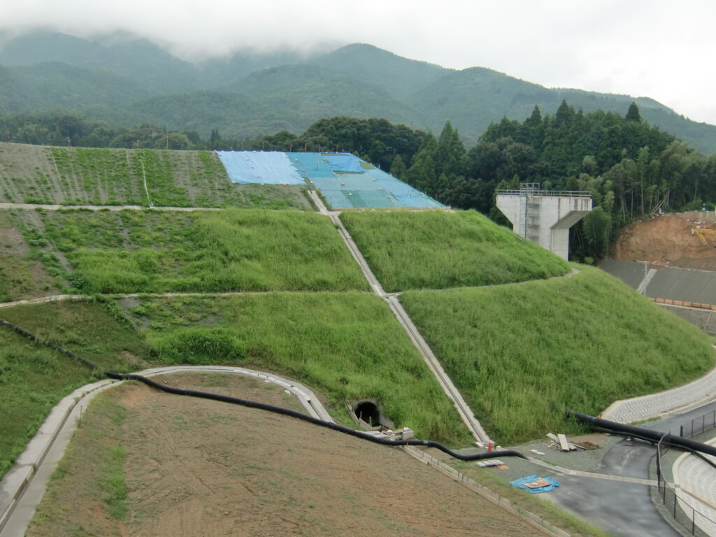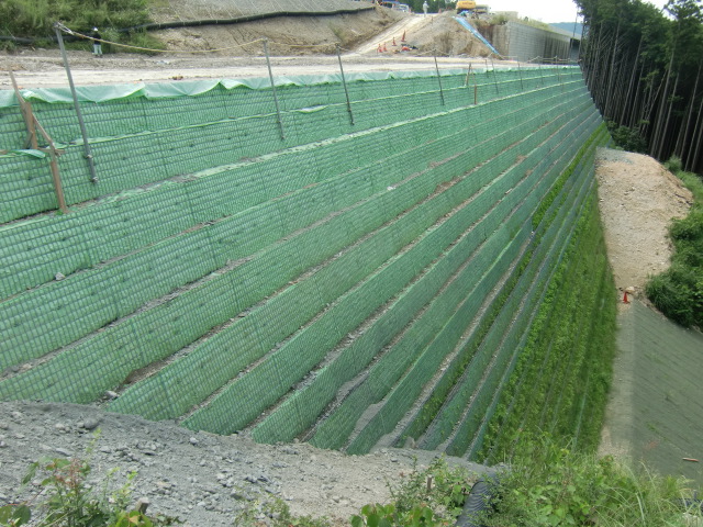 補強土壁とは、土の中に補強材(ジオグリッドや鋼材など)を敷設することで、補強材と盛土材の間の摩擦抵抗力によって盛土の安定を補い、急勾配の盛土および擁壁構造を造る構造物です。